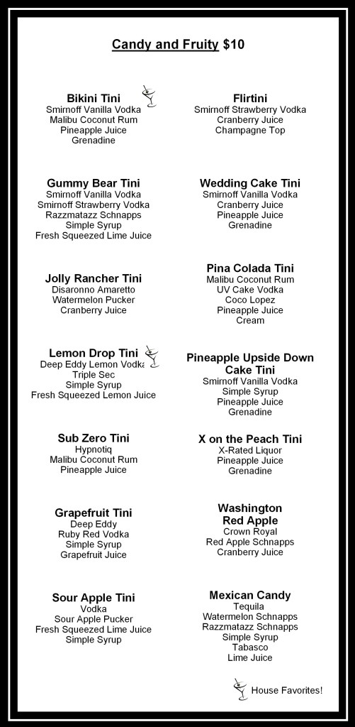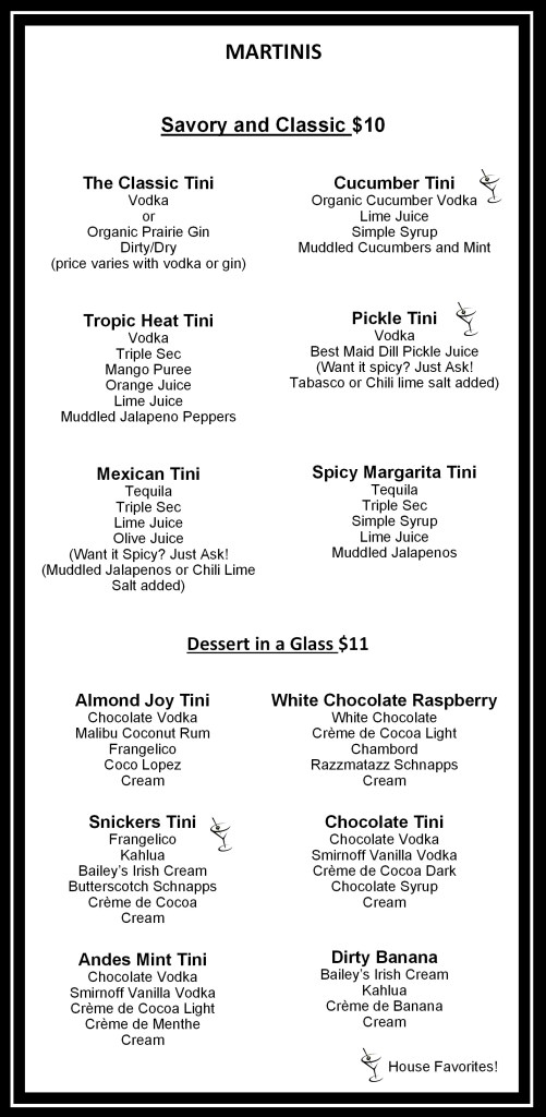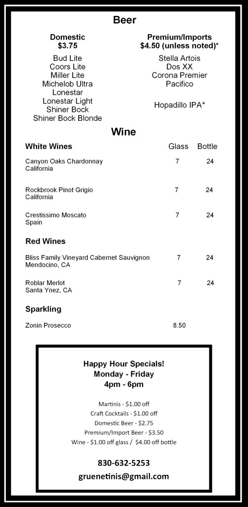 Drink Menu With over 25 Delicious Martinis, there is a flavor for everyone at Gruene Tinis! Share this: Click to share on X (Opens in new window) X Click to share on Facebook (Opens in new window) Facebook Like Loading...
